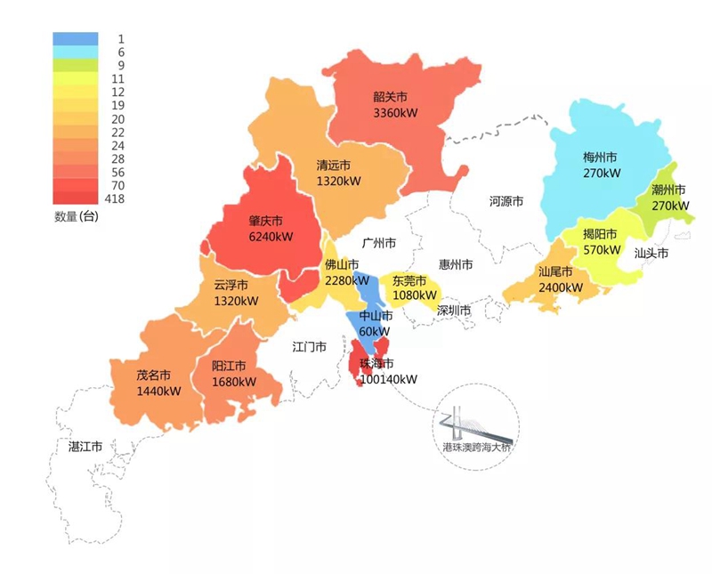 2018年,在港珠澳大桥充电桩项目中,上海宝优妮实业有限公司在港珠澳大桥珠海端口岸人工岛搭建的充电管理平台及电能量采集终端,为大桥的绿色运营和电力保障提供技术支持。除此之外,仅广东省内,上海宝优妮实业有限公司充电桩涵盖肇庆、珠海等14个城市,具体分布情况如下图所示。